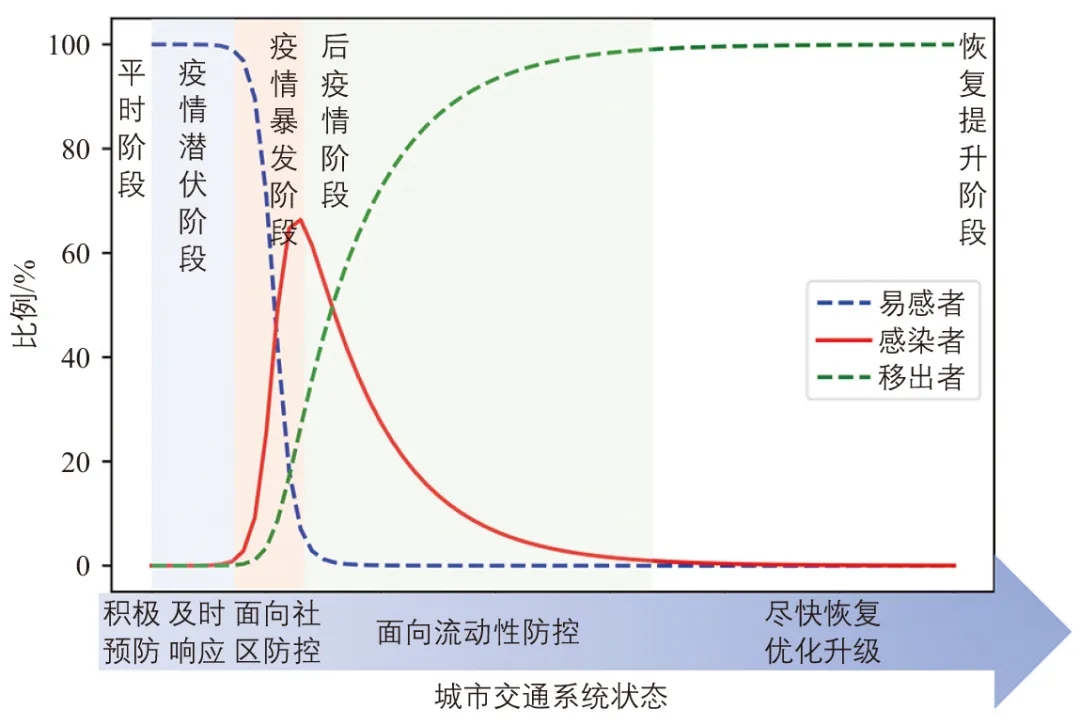 SIR模型(Susceptible Infectious Recovered Model)作為經(jīng)典的傳染病模型,已在國內(nèi)外疫情預測領域得到廣泛認可和應用[5-6]。依據(jù)SIR模型,可將城市交通系統(tǒng)在疫情下經(jīng)歷過程分為如下圖所示的5個階段。圖中縱坐標為易感者(Susceptible,暫時未感染但無免疫力具有感染風險的人群)、感染者(Infectious,已被感染且具有傳染力的人群)、移出者(Recovered,不會被再次感染的人群,指移出傳染系統(tǒng)的人群)占總?cè)藬?shù)的比例,橫坐標為疫情不同階段交通系統(tǒng)狀態(tài)。