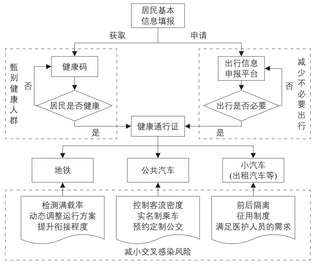 地鐵部門要積極與鐵路等部門進行數(shù)據(jù)對接,提升與其他交通工具的銜接程度,實時檢測各個車站的客流密度和各車站運行列車的滿載率,動態(tài)調(diào)整列車運行計劃,均衡客流密度。而私密性更好的出租汽車和網(wǎng)絡約租車等可繼續(xù)保障醫(yī)護人員的出行,必要情況下可繼續(xù)將部分車輛交由政府統(tǒng)一調(diào)配,同時為避免交叉感染可前后排隔離。綜上,后疫情階段居民通勤出行的流程如下圖所示。